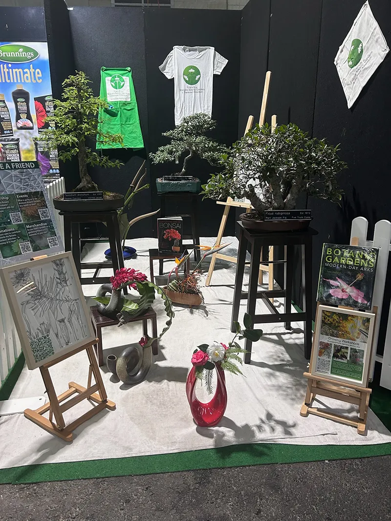 UPDATE: Monday is a day for change and our Ekka display has new bonsais and flower arrangements. Can you guess where in the Botanic Gardens the plant material has come from?